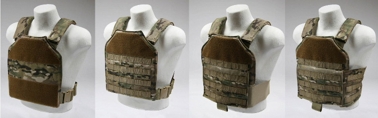 Four different AR500 Plate Carrier versions provide the end user with multiple options when choosing a plate carrier to support the Level IV composite hard plates. From left to right the PC is available in a low profile, molle, elastic and full cumber version.